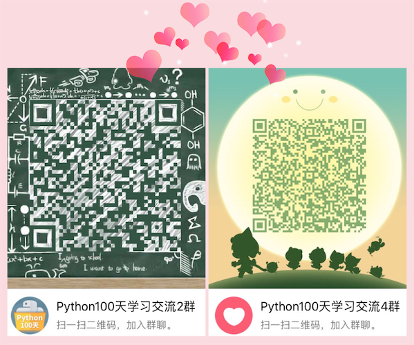 说明:最近有很多想学习Python的小伙伴申请单独加我微信和QQ,因为我自己平时也很忙,没办法一一解答大家的问题,我创建了Python100天学习交流2群Python100天学习交流4群两个交流群,群号分别为213132758661325483,二维码在下方(建议大家加4群,因为2群也即将满员)。我的同事和朋友很多也在这个群里,他们都是优秀的Python开发者,有丰富的商业项目经验,我们在时间充足的时候会及时解答大家的问题,而且从Python语言入门到Web应用开发,从数据分析到机器学习,每个领域都有技术大咖为大家解惑答疑。以后我们争取每周做一次视频直播,以专题的形式分享Python开发的点点滴滴,同时还会不定期的举办线上和线下的技术交流和分享活动,小伙伴们可以加群进行交流。感谢千锋教育Python教学部对本群的支持。