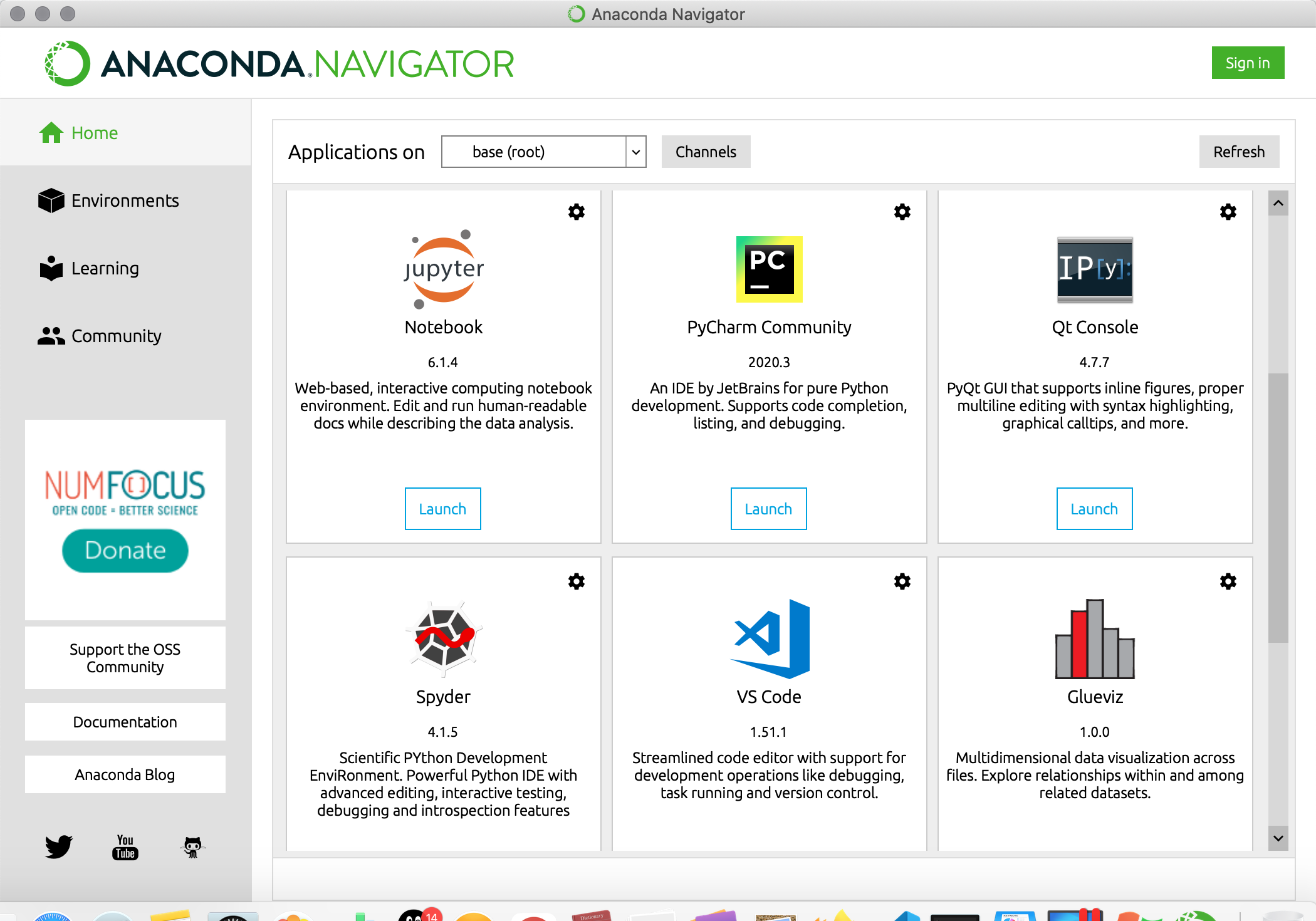 完成安装后,macOS用户可以在“应用程序”或“Launchpad”中找到名为“Anaconda-Navigator”的应用程序,运行该程序可以看到如下所示的界面,我们可以在这里选择需要执行的操作。