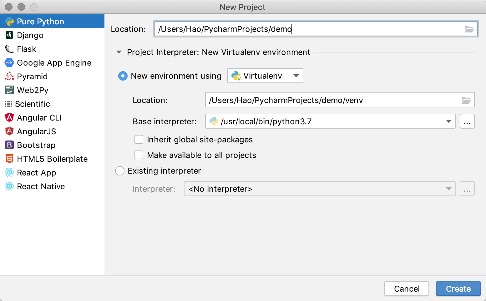 接下来,我们要为项目创建专属的虚拟环境,每个Python项目最好都在自己专属的虚拟环境中运行,因为每个项目对Python解释器和三方库的需求并不相同,虚拟环境对不同的项目进行了隔离。在上图所示的界面在,我们可以选择新建虚拟环境(New environment using Virtualenv),这里的“Virtualenv”是PyCharm默认选择的创建虚拟环境的工具,我们就保留这个默认的选项就可以了。
