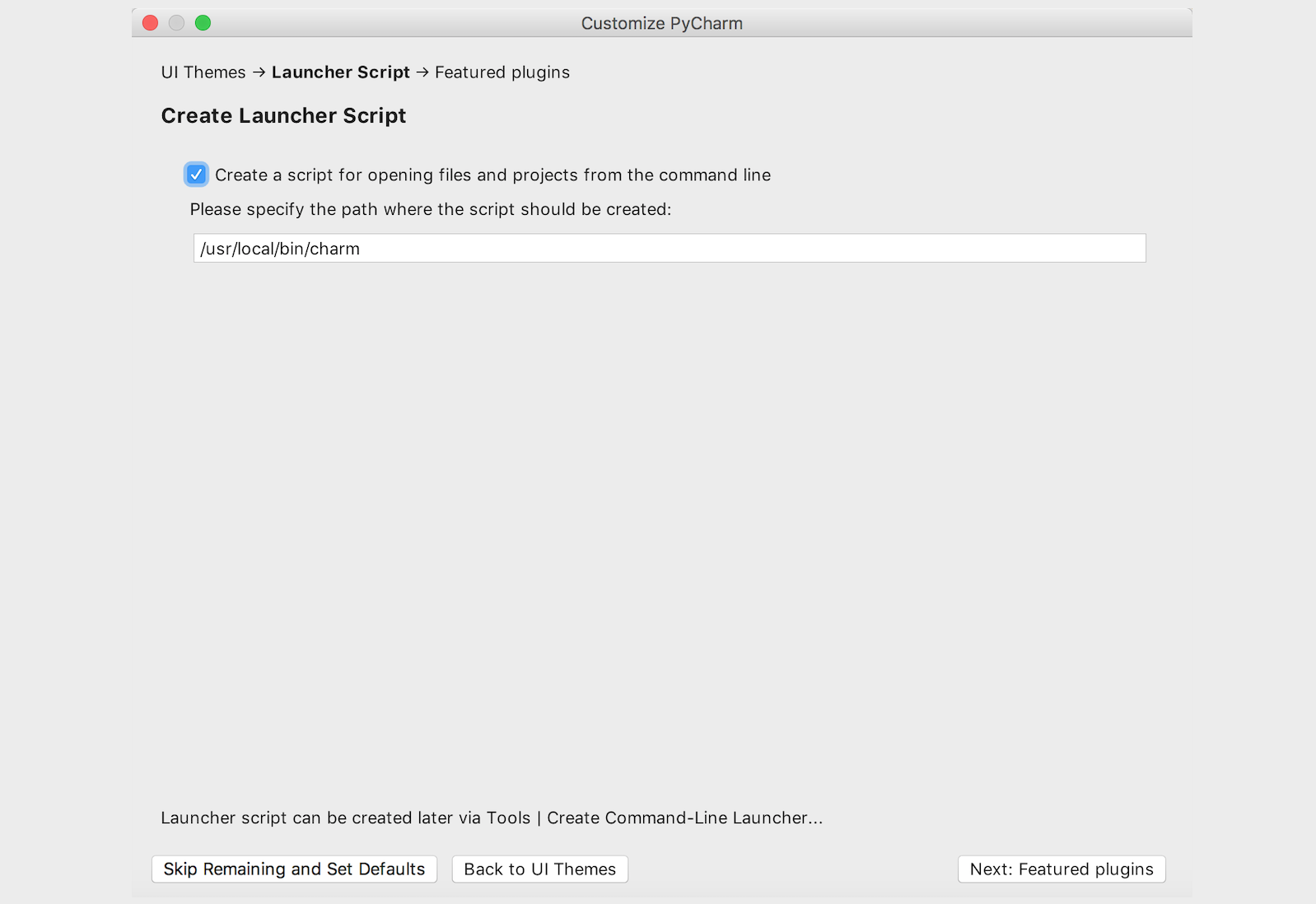 再接下来是创建可以在“终端”或“命令行提示符”中运行PyCharm的启动脚本,当然也可以不做任何勾选,直接点击“Next: Featured plugins”按钮进入下一环节。